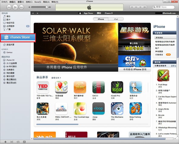 第一步:启动iTunes软件,连接您的iPhone到PC或MAC,并进入"iTunes Store - App Store" 页面。