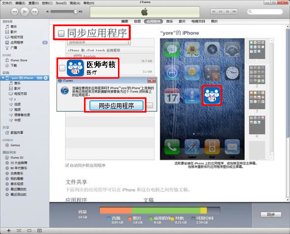 第四步:完成下载后,返回应用程序页。打开iPhone同步选项中的应用程序内容,在医师考核图标前打勾,点击右下 "同步" 按钮,完成后您的iPhone桌面上就会出现医师考核的启动图标,表示安装成功。